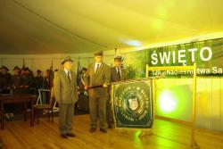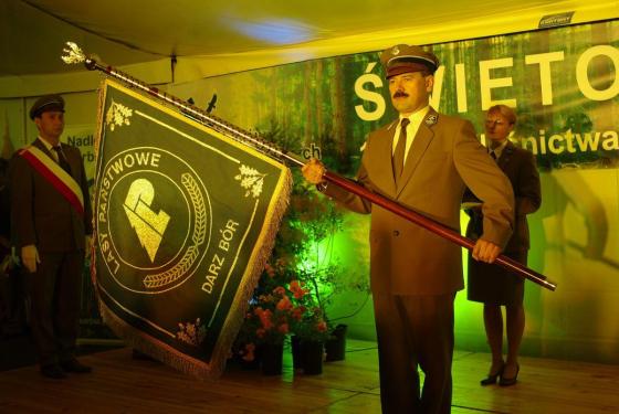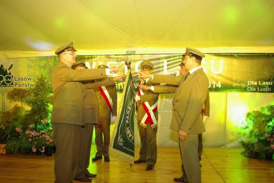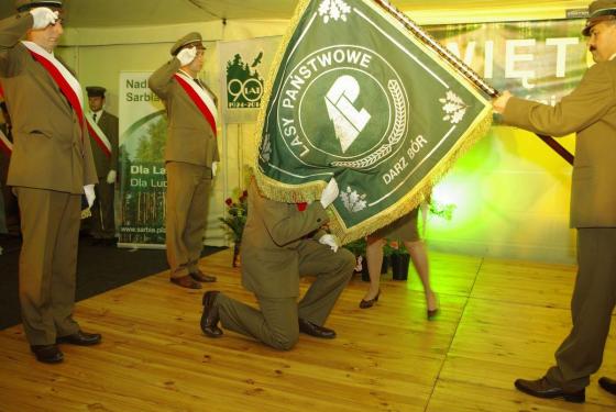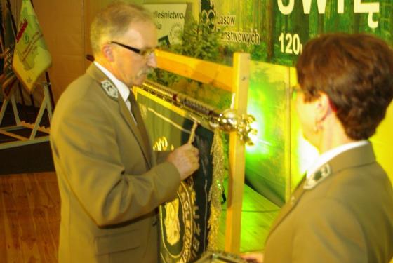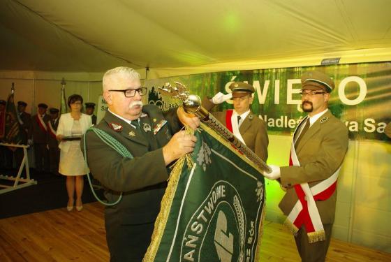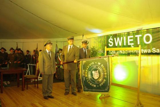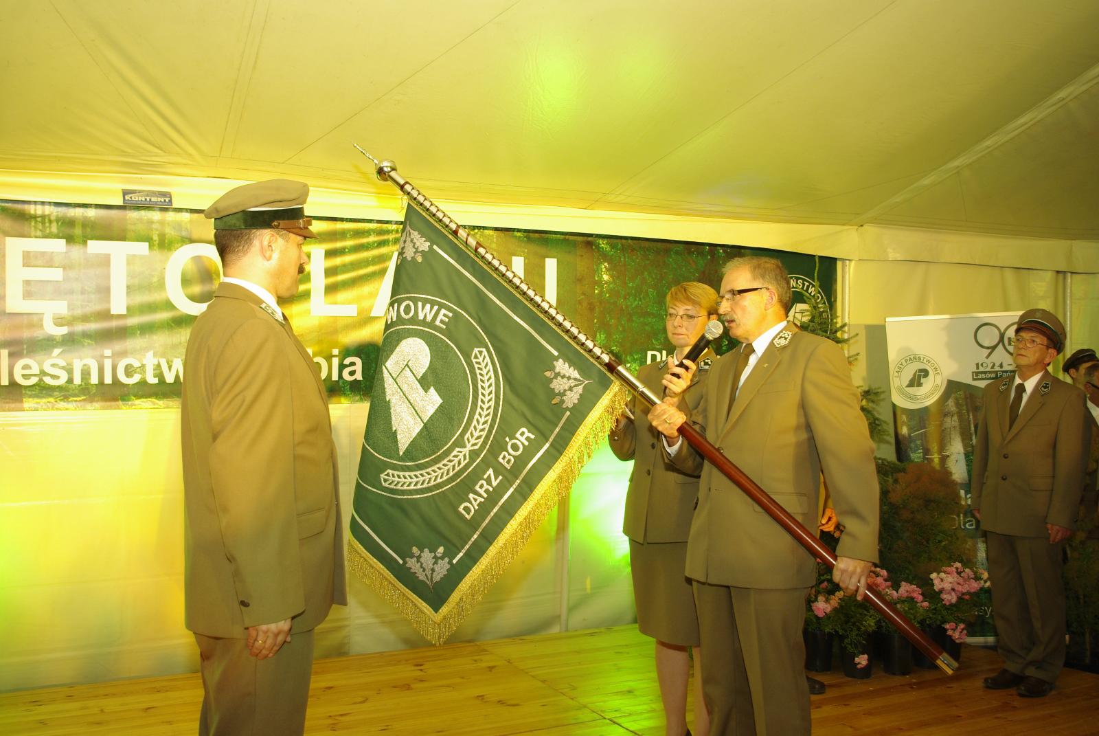 Dyrektor Ryszard Standio przekazuje sztandar Nadleśnictwa Sarbia Nadleśniczemu Maciejowi Strawie. (Fot. Radosław Napierała)