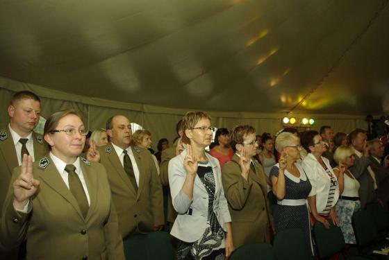 Po przywitaniu przez Nadleśniczego dr inż. Macieja Strawę wszystkich zebranych i wygłoszeniu referatu na temat gospodarki leśnej nadleśnictwa przez Zastępcę Nadleśniczego mgr inż. Damiana Szcześniaka, nadszedł uroczysty moment ceremoniału sztandarowego. Ceremoniał rozpoczął Pan Stanisław Gajowski Przewodniczący Komitetu Fundacyjnego odczytując Akt Fundacyjny Sztandaru Nadleśnictwa Sarbia. Po jego odczytaniu na scenę zaproszono fundatorów sztandaru, którzy w symboliczny sposób dokonali wbicia pamiątkowych gwoździ oraz dokonali wpisu w akcie fundacyjnym. Należy podkreślić, że sztandar ufundowały 123 osoby i instytucje. Następnie głos zabrał Dyrektor RDLP w Pile Ryszard Standio, który odczytał Akt Nadania Sztandaru Nadleśnictwu Sarbia, po czym przekazał sztandar w ręce Nadleśniczego Nadleśnictwa Sarbia Macieja Strawy. Nadleśniczy podziękował za tak cenny dar będący symbolem wartości, które są i będą fundamentem pracy zawodowej leśników dla dobra polskich lasów i ojczystej przyrody. Po zaprezentowaniu sztandaru przez Nadleśniczego nastąpiło przekazanie go pocztowi sztandarowemu i uroczyste ślubowanie na sztandar pracowników Nadleśnictwa Sarbia.
