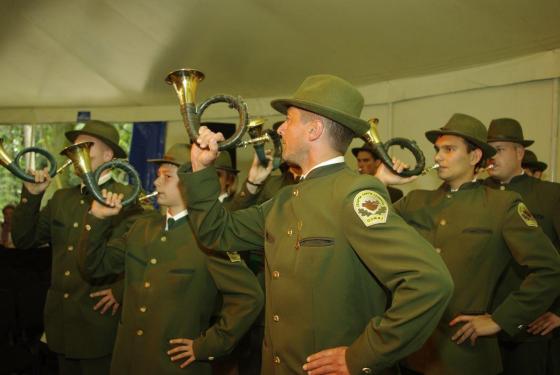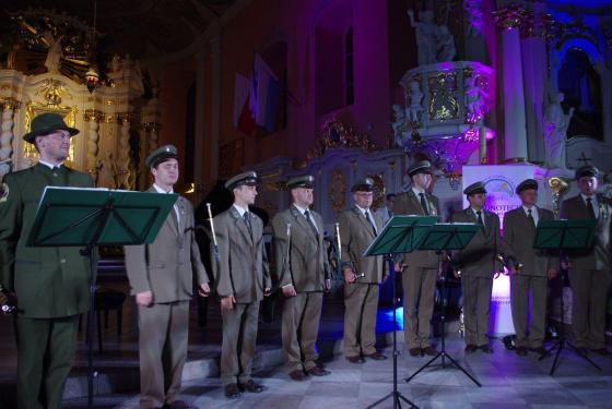 Zespół Trębaczy Myśliwskich „Wilk" Nadleśnictwa Sarbia podczas koncertu „Muzyka Lasem Inspirowana". (Fot. Radosław Napierała)