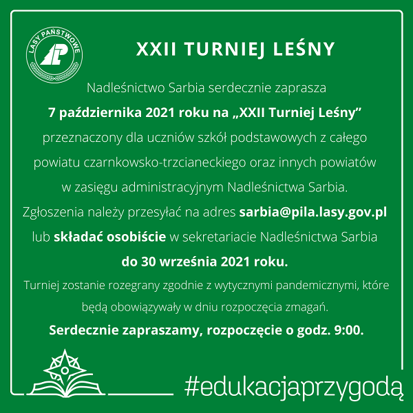 Nadleśnictwo Sarbia serdecznie zaprasza 7 października 2021 roku na „XXII Turniej Leśny” przeznaczony dla uczniów szkół podstawowych z całego Powiatu Czarnkowsko-Trzcianeckiego oraz innych powiatów w zasięgu administracyjnym Nadleśnictwa Sarbia. Zgłoszenia należy przesyłać na adres sarbia@pila.lasy.gov.pl lub składać osobiście w sekretariacie Nadleśnictwa Sarbia do 30 września 2021 roku.
