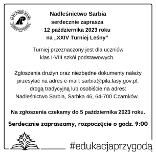 Nadleśniczy Nadleśnictwa Sarbia wraz z Pracownikami serdecznie zaprasza 12 października 2023 roku do udziału w XXIV Turnieju Leśnym.